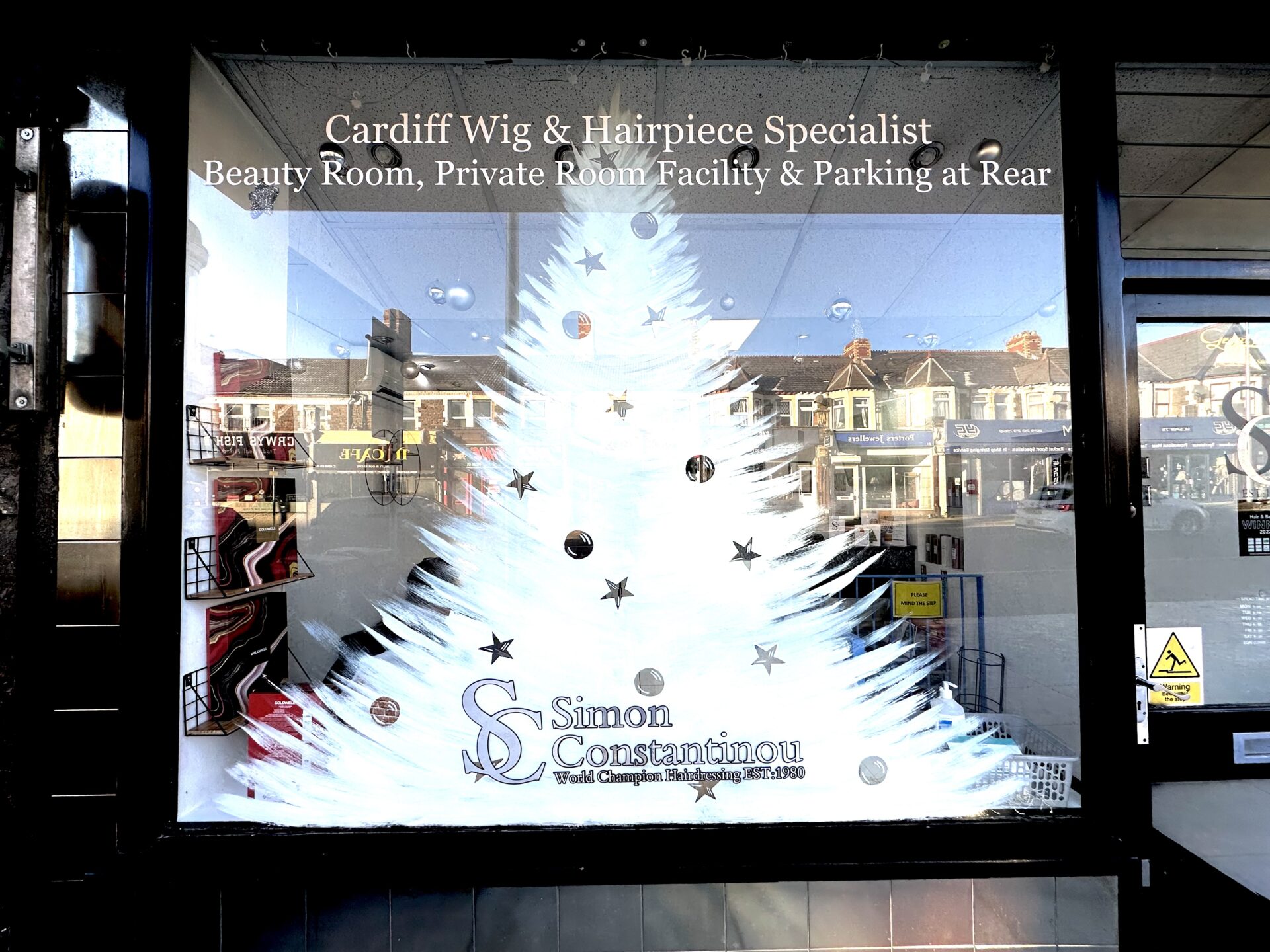 Christmas Window at Simon Constantinou Hairdressers and Barbers Cardiff