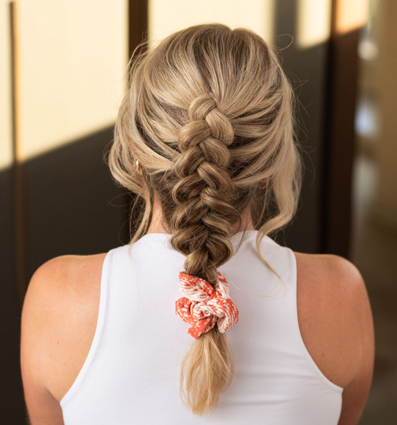 Back of woman with hair braid and scrunchie. Photo from Goldwell
