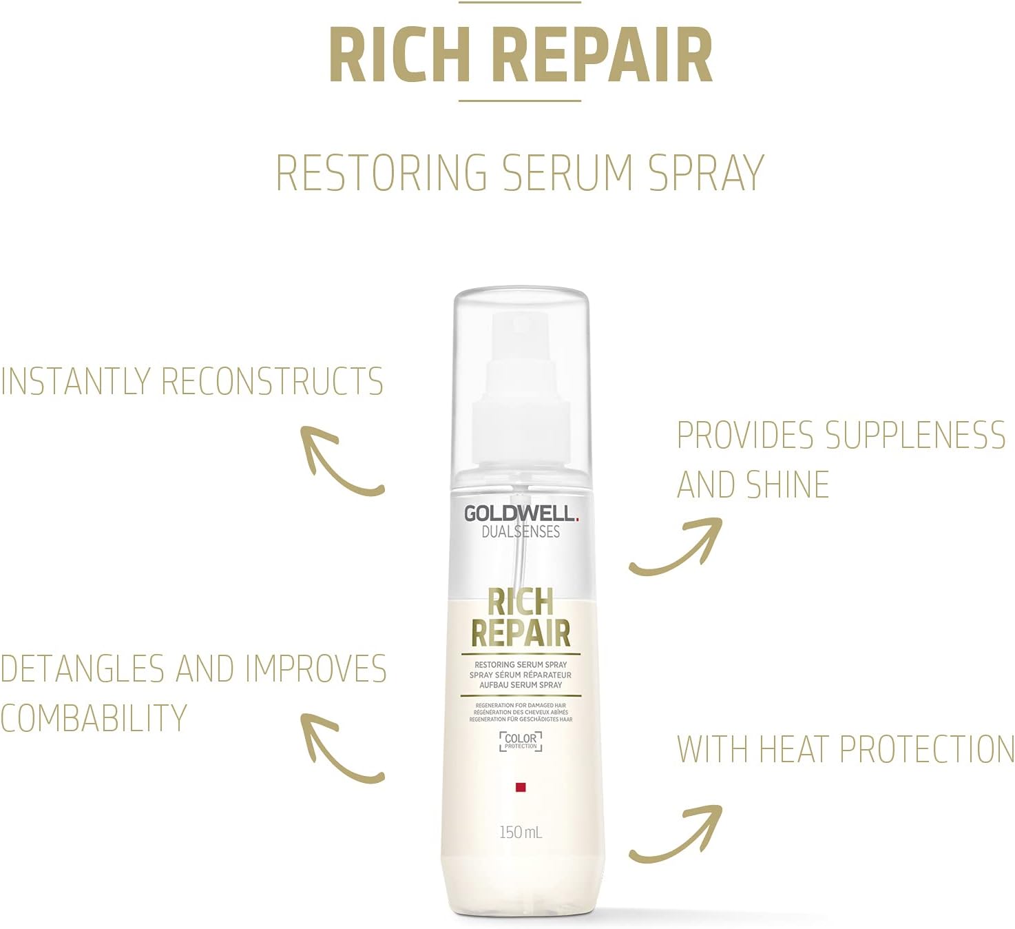 Goldwell Dualsenses Rich Repair Serum Spray: A versatile leave-in spray and light serum with heat protectant benefits It nourishes and shields hair without weighing it down Say goodbye to frizz and hello to silky-smooth, manageable locks Suitable for all hair types, it consistently delivers salon-quality results Elevate your hair care routine today.